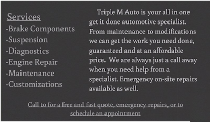 Triple M Auto is a primarily mobile automotive repair and customization service. Save the headache of appointments, having a ride, waiting, or being booked out and get te repairs you need, done right and on time. Most repairs come with a 12 month 12,000 mile parts and labor warranty with roadside assistance. Diagnostics, Repair, Maintenance, and much more. From 60s classics to Euro Luxury and Specializing in JDM vehicles. Call or text anytime for a free quote or to schedule an appointment!